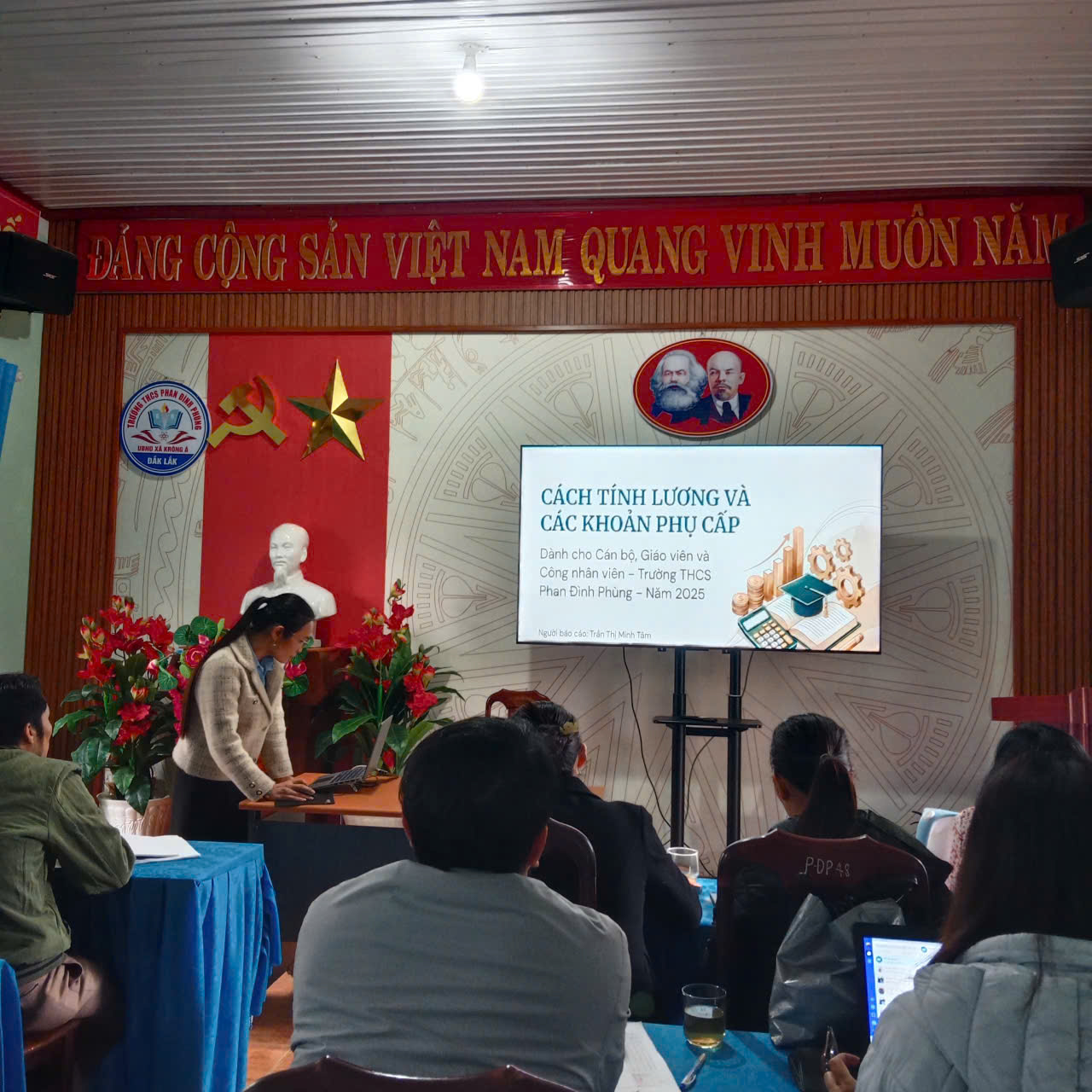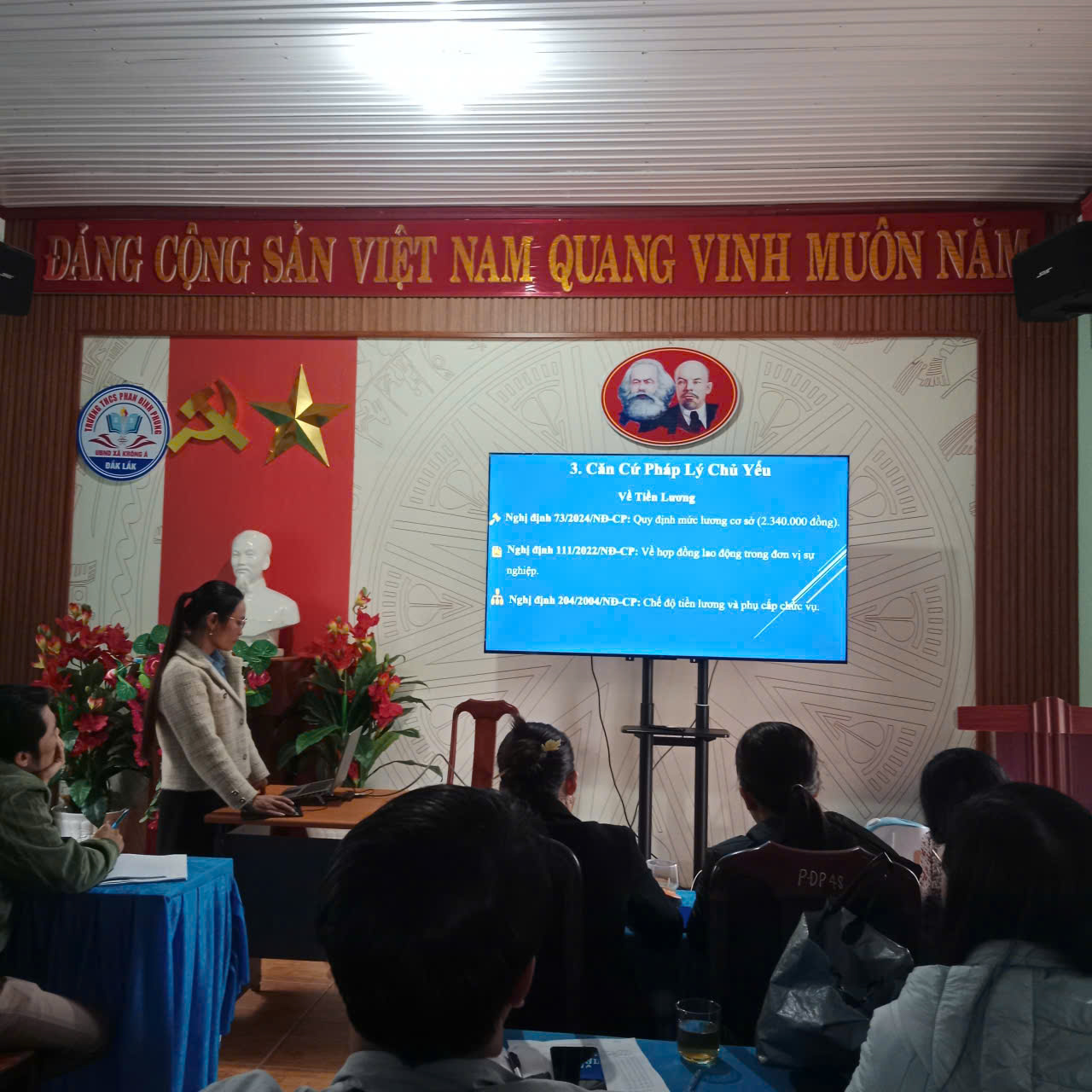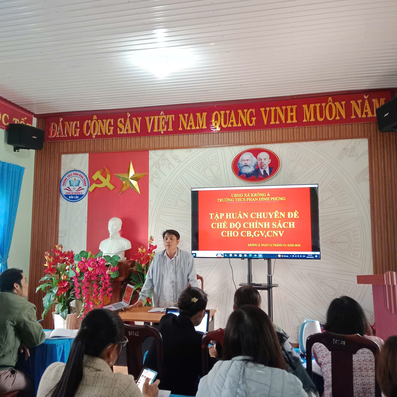 Chiều ngày 22/0/2026, bộ phận kế toán trường THCS Phan Đình Phùng đã tổ chức một buổi chuyên đề về các chế độ chính sách dành cho cán bộ, giáo viên và công nhân viên trong trường. Buổi chuyên đề này nhằm cung cấp thông tin đầy đủ và chính xác về các quyền lợi, chế độ đãi ngộ cũng như các quy định mới liên quan đến lương, thưởng, bảo hiểm xã hội, bảo hiểm y tế, và các phúc lợi khác mà mỗi cán bộ, giáo viên, công nhân viên cần nắm rõ trong quá trình công tác.
